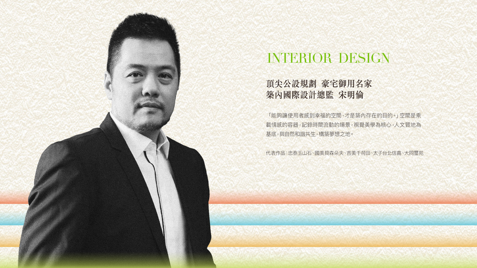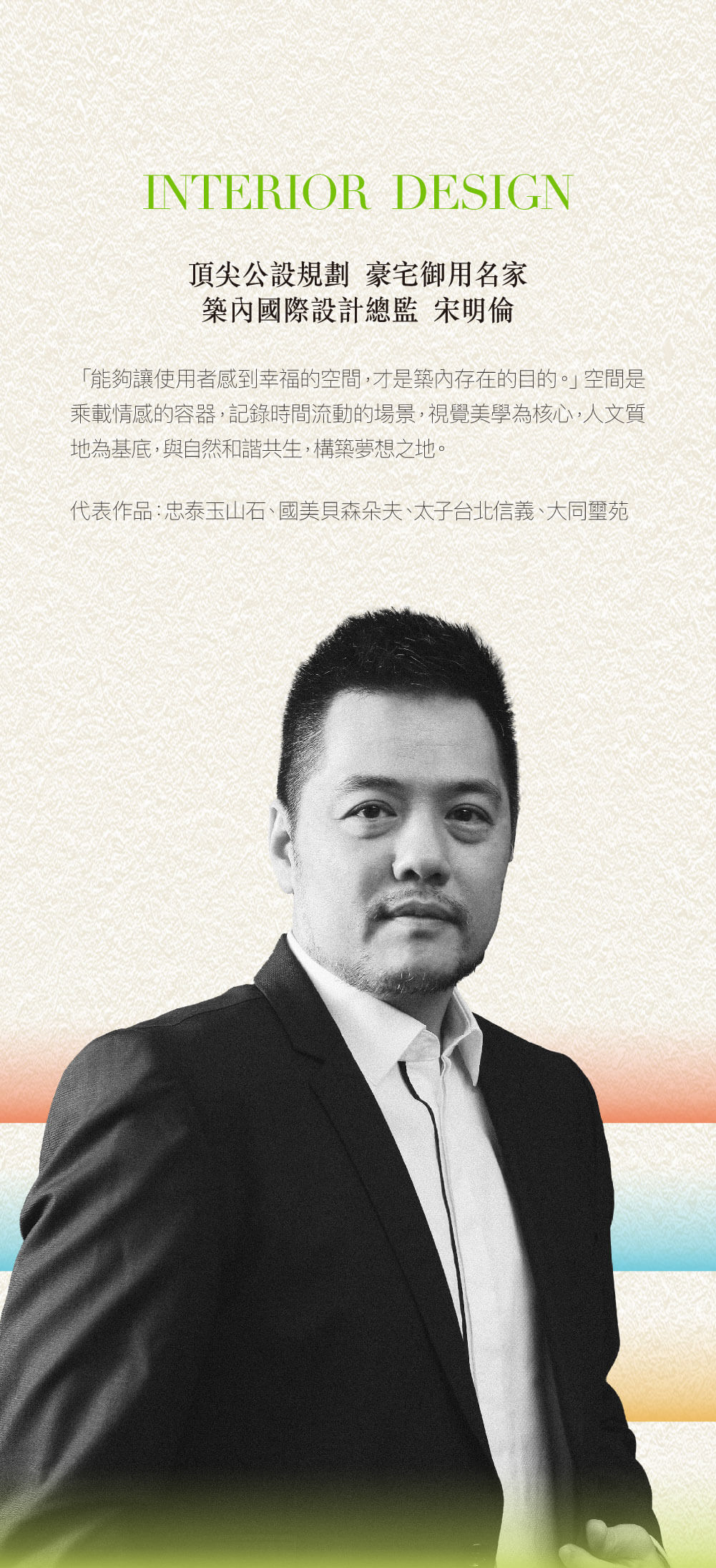忠泰集團-義泰建設,本於不設限跨界精神,邀集各領域品味菁英,詮釋理想生活體驗。2022年開始以內湖五期為展演場,打造「街道美術館」三部曲—「義泰吾境」、「義泰值境」、「義泰田境」,透過3座建築作品的對話,用都市尺度探尋理想生活的可能性,引領建築造境概念新風潮。