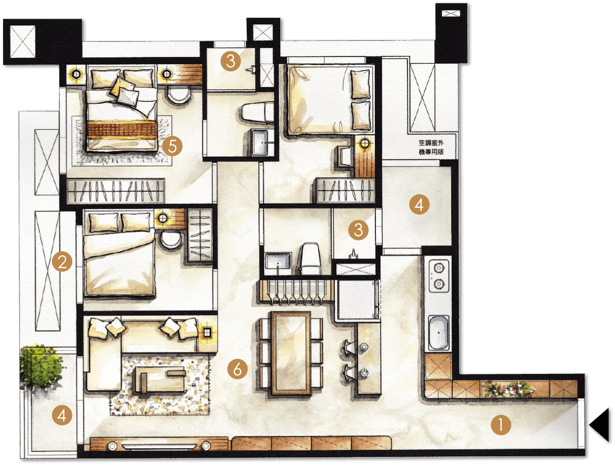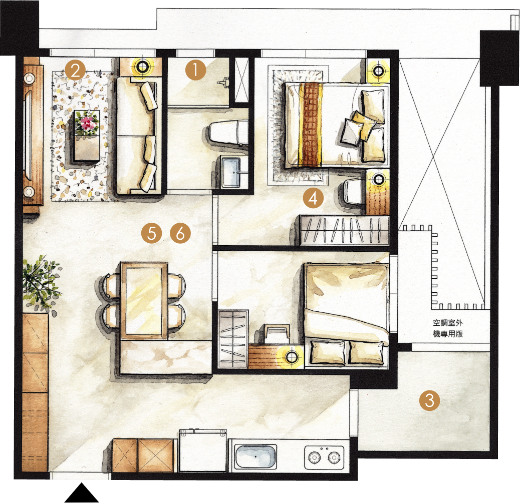 本圖為傢俱配置參考樣式,未依等比例製作,僅供解說對照使用,其空間格局、尺寸裝潢、傢俱及裝飾等均為示意表現,非屬買賣契約給付內容。實際空間格局配置、尺寸悉依主管機關最終核定之圖說為準,相關建材設備依房屋買賣契約書和相關約定之記載為準。