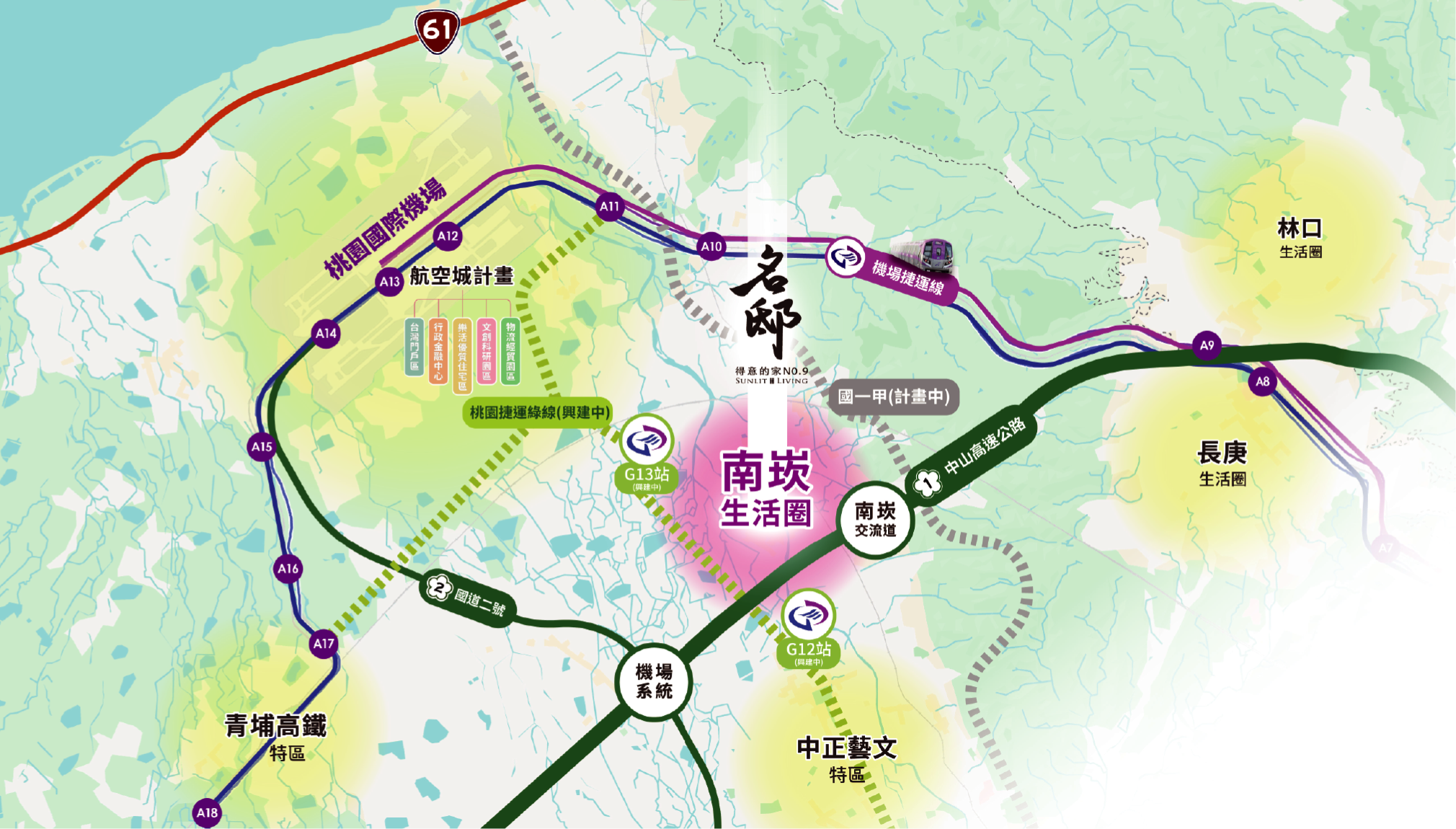 大台北生活圈首環,國道1號串連台北與桃園核心區域,2026年桃捷綠線預計完工通車,收穫G12・G13雙站利多,2028年國道預計新增北上匝道,軌道經濟效益再升級