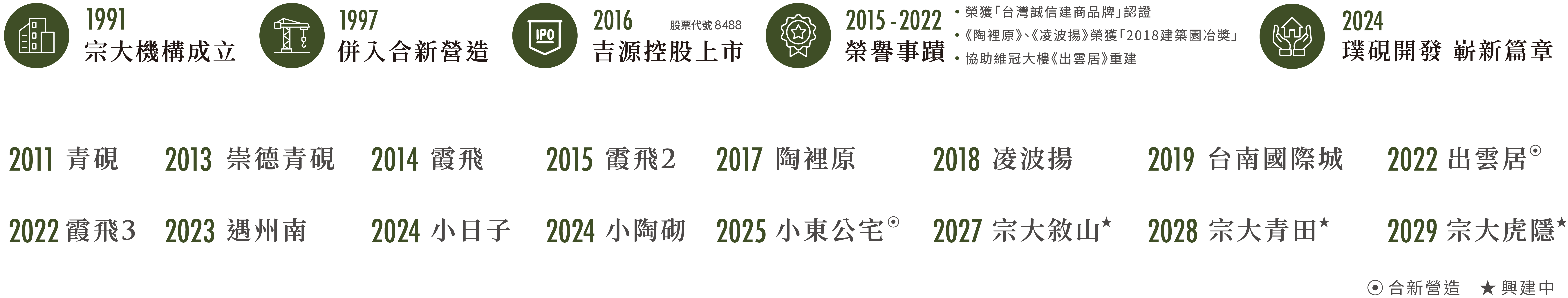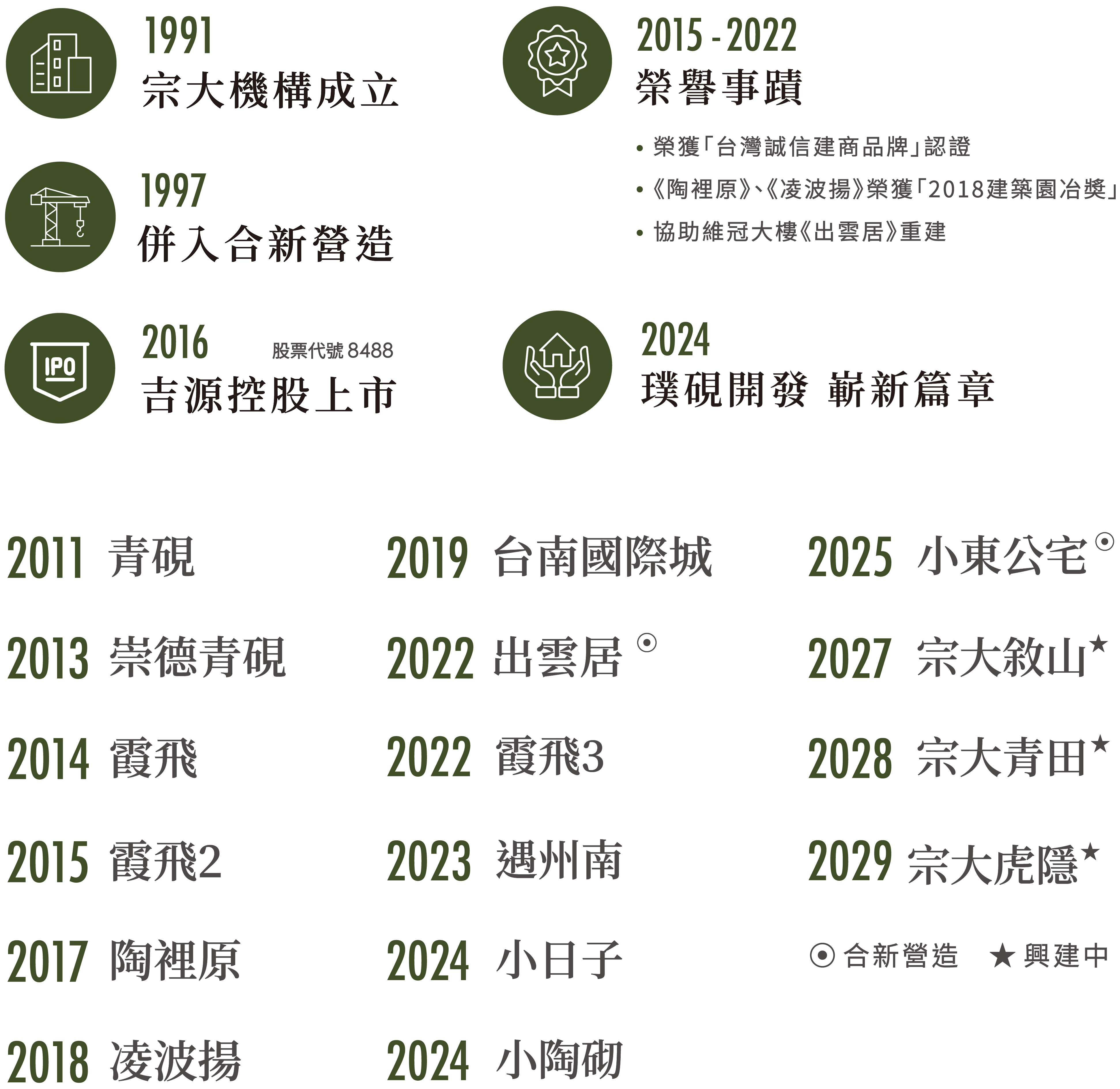 宗⼤建設⾃1991年起扎根台南,以「連結你我,發現⽣活」理念,攜⼿在地美好⼈、事、物,30餘年來擘建近50件建築作品,為超過3,000戶客戶幸福成家,屢獲誠信建商與建築園冶獎等專業肯定。宗大集團橫跨建設、營造、飯店、金屬包裝等四大事業體,旗下合新營造亦參與校園、維冠大樓重建與小東路青年公宅等重大工程,為宜居台南,敬獻一己之力。