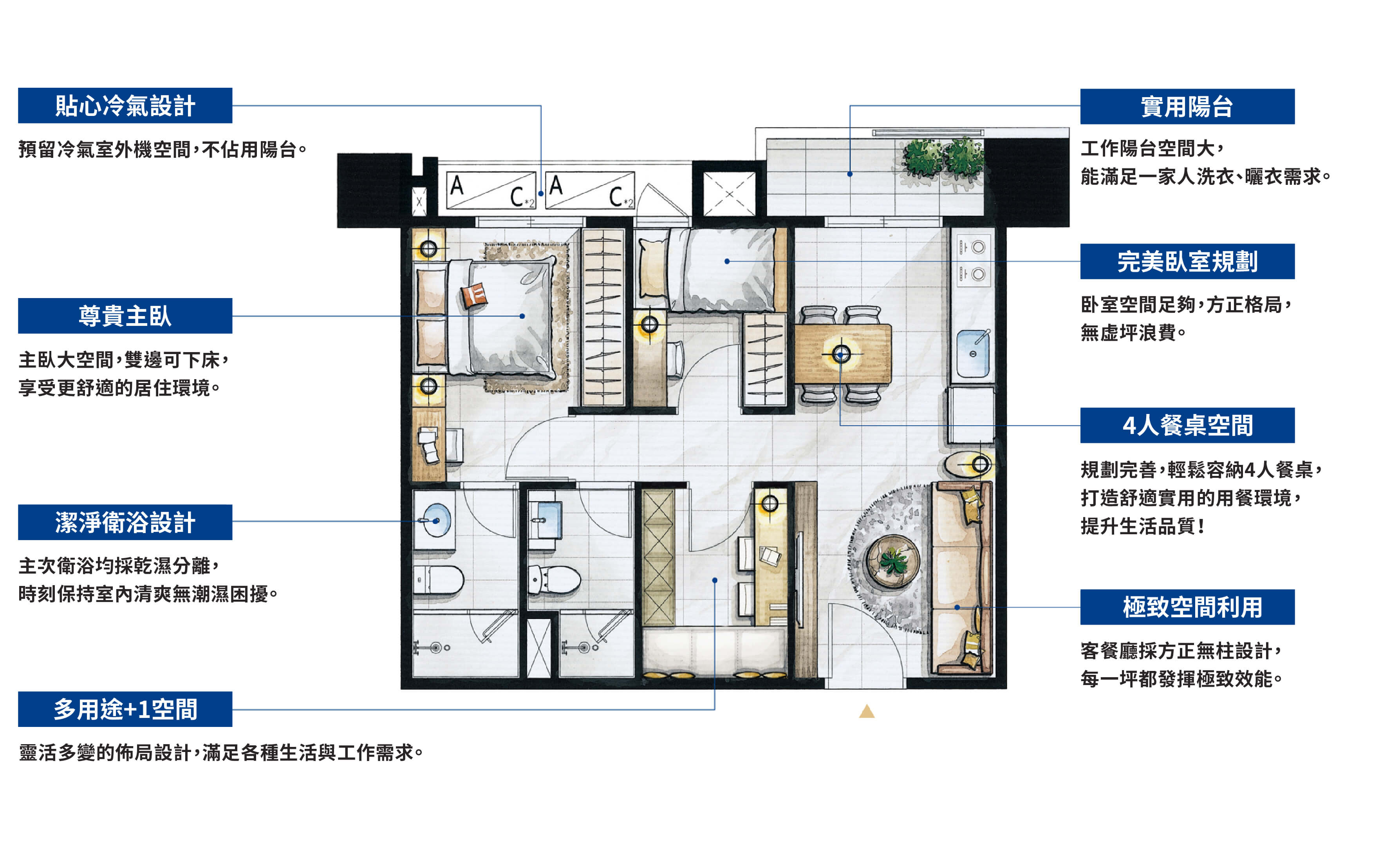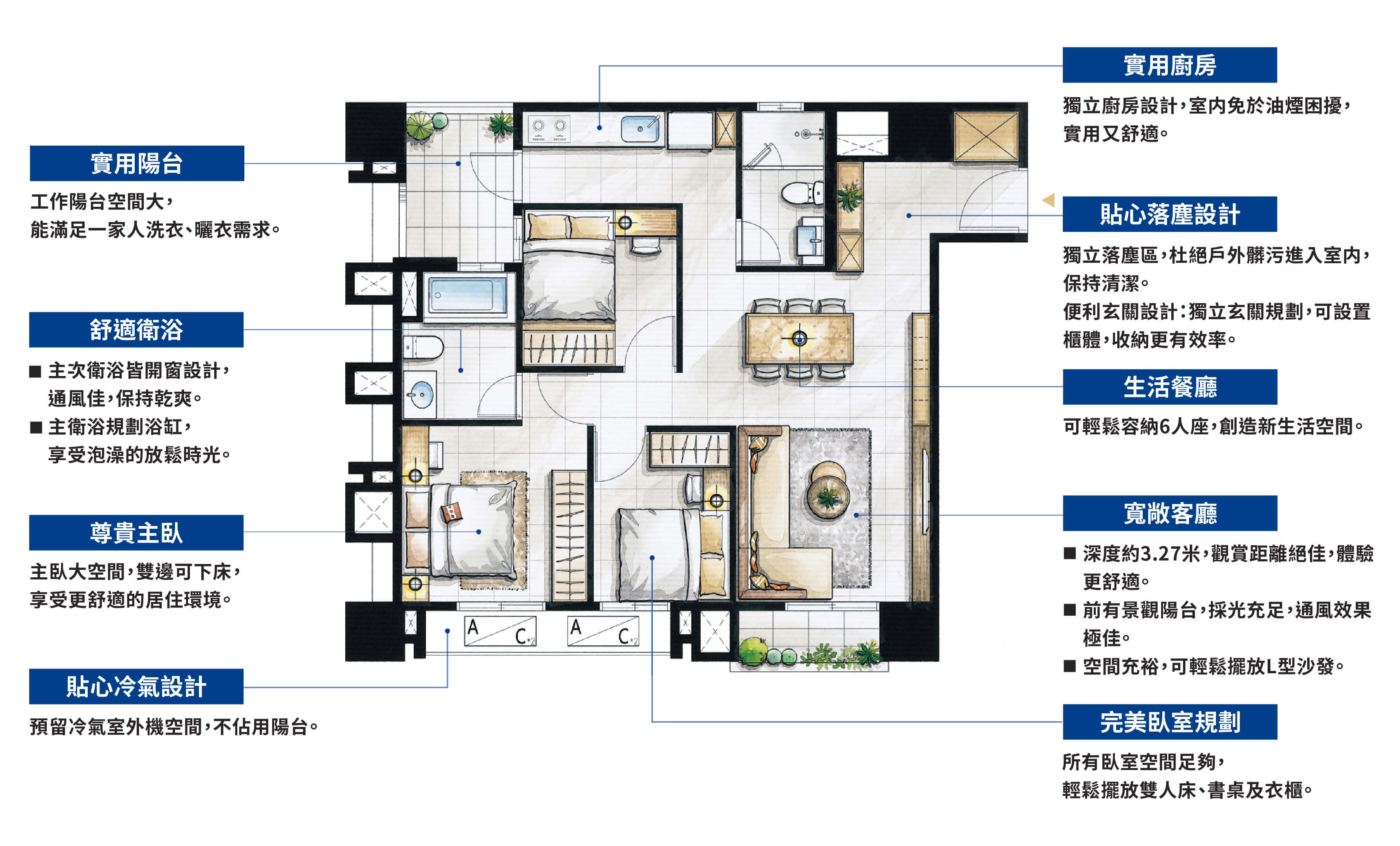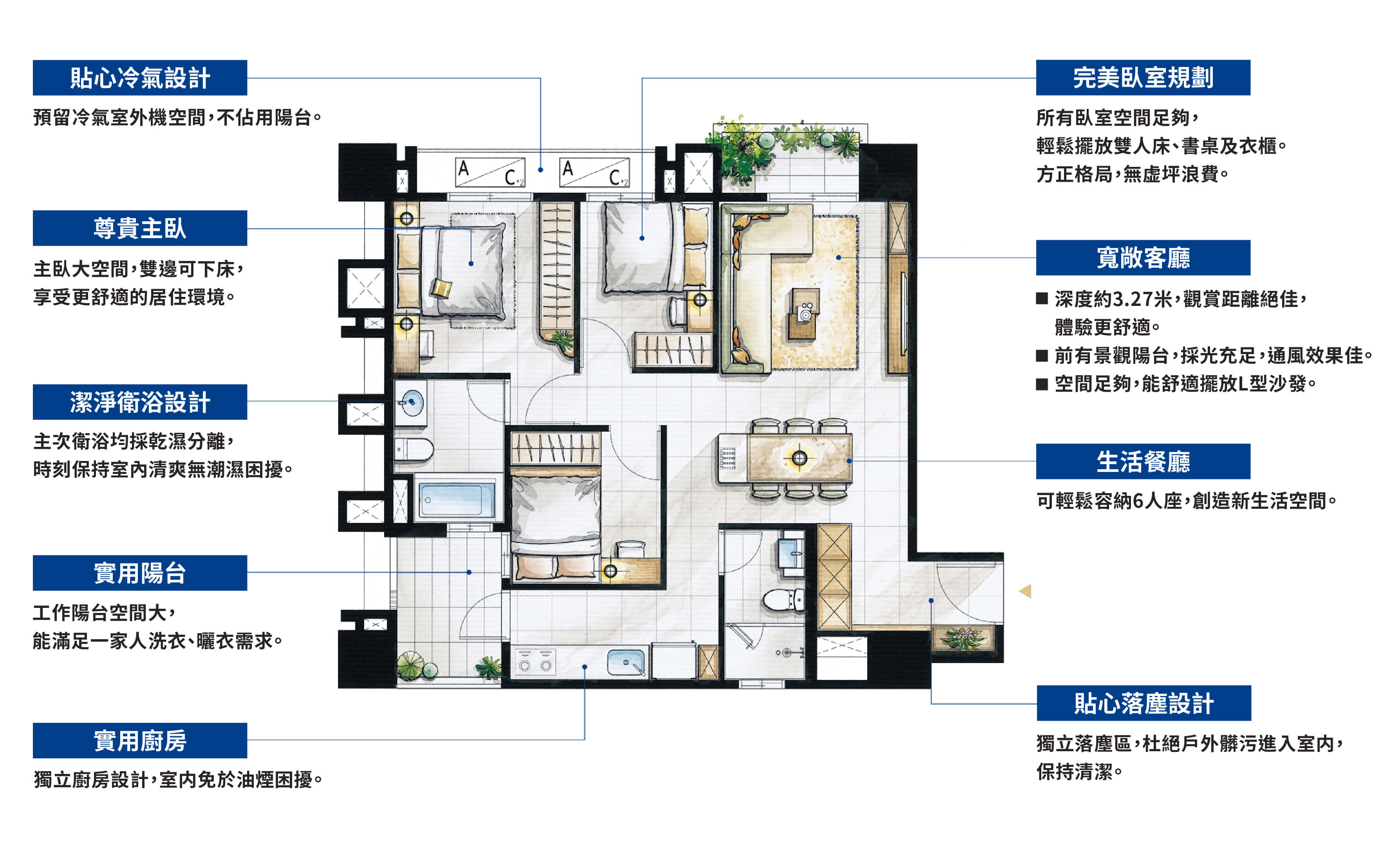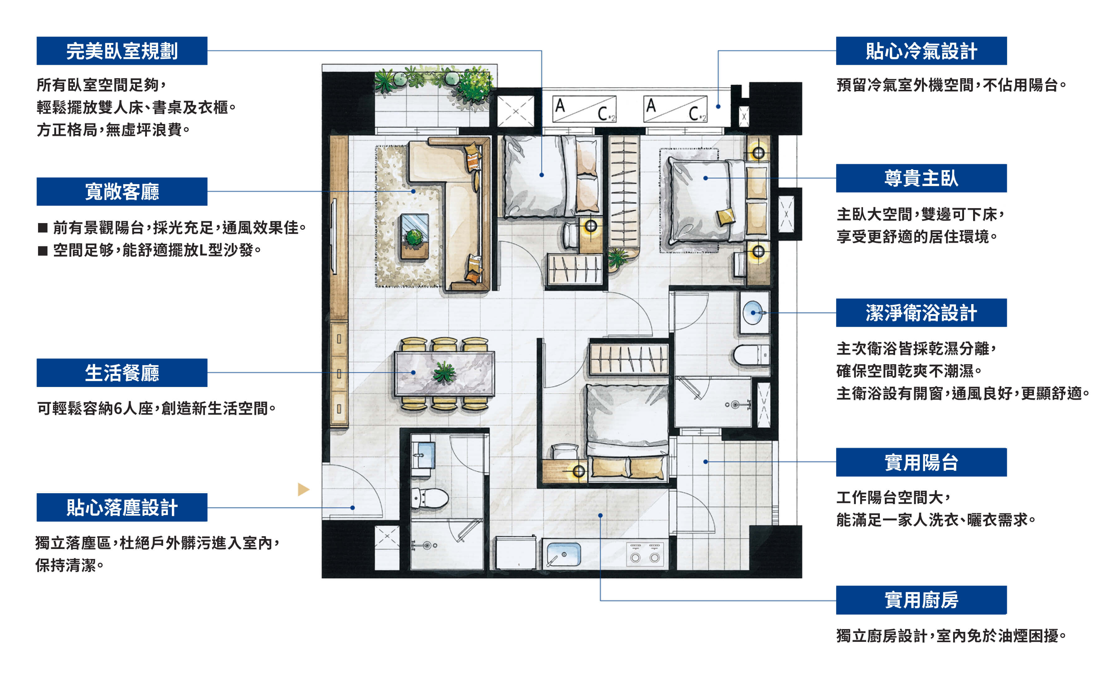 致力為居住者提供符合地段、美學、收藏、實用、安心,5V價值(VALUE)的理想居所。